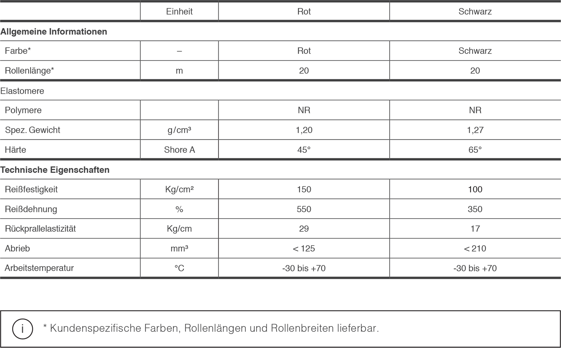 Ambelt® Seitenführungsgummi wird als Rollenware in verschiedenen Farben und Qualitäten angeboten und ist in den Stärken von 5 mm bis 30 mm und in den Höhen von 60 mm bis 200 mm ab Lager lieferbar.
